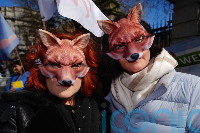 Some of the protesters on Wednesday dressed up as Suffragettes in Edwardian costumes, while others wore fox masks.